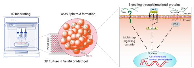 由于进入的空气中含有免疫系统需要对抗的病毒、污染物和过敏原,免疫系统承受着很大的压力。肺癌是世界上最常见的癌症死亡原因(Zscheppang, 2018)。这是一种复杂的疾病,需要更多的生理相关模型来理解细胞异常行为背后的机制。传统上,体外癌症模型是基于二维单层培养的,这有助于研究人员对癌变机制有更深入的了解。然而,研究人员开始意识到使用平面模型研究发生在生物体中的复杂疾病的局限性。哺乳动物细胞嵌入细胞外基质(ECM)中生长,细胞外基质赋予组织机械特性,促进细胞间通讯(Baker, 2012)。因此,必须开发仿生肺肿瘤模型,以便更好、更快地测试潜在的候选药物。此外,转移和癌症进展的研究对于更好地了解这种疾病以及如何对抗它至关重要。癌细胞经常在三维微环境中自组装成多细胞肿瘤球体。这些成熟的结构允许细胞和周围环境之间的相互作用。在本研究中,研究了生物打印3D构建物中肺癌细胞球形结构的形成,并使用相关分子标记,如β-catenin、CD44和(ZO-1),与2D培养物进行了比较(图1)。