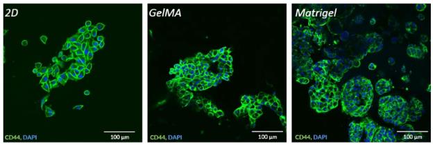 图4:A549的CD44(绿色)和DAPI(蓝色)在二维单层细胞中的表达于第4天,在GelMA和Matrigel的三维培养中表达于第14天。为了更好地可视化定位,对每个条件下的图像处理进行了优化。比例尺= 100µm