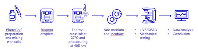 图 1 从冰桶到 96 孔板:PhotoCol® 冷打印 → 37 °C 热自交联 → 405 nm 光固化,全程 15 min 完成