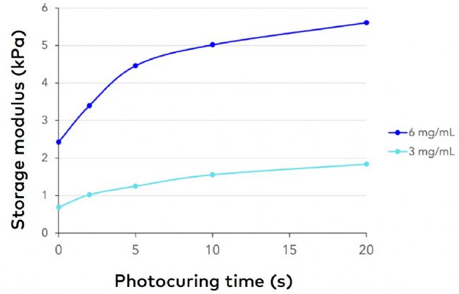 图 2 存储模量 G′:3 mg/mL 与 6 mg/mL 在 2–20 s 光固化时间内快速达到平台值,5 s 后几乎不再增加