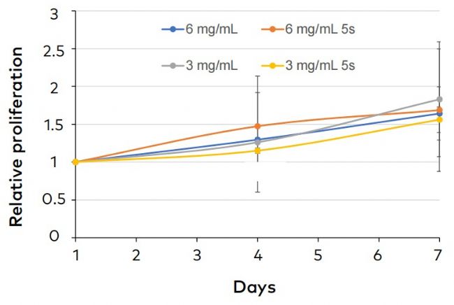 图 5 Day-7 相对增殖:5 s 组 2.5×,无固化组 2.4×,无显著差异