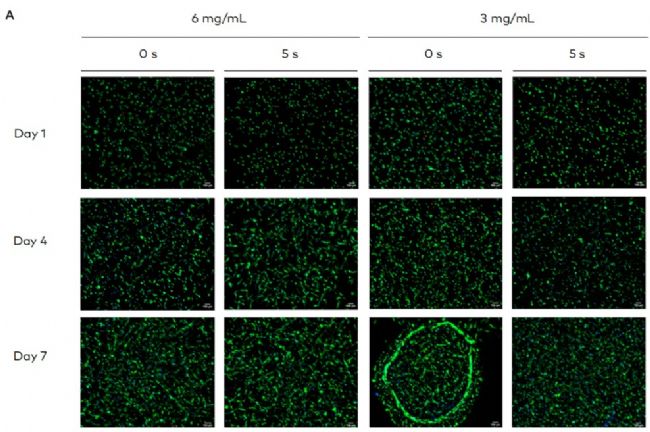 图 6 Day-1 圆细胞 → Day-4 伸展 → Day-7 网络,5 s 固化组更快铺展
